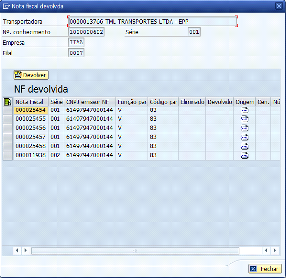 A tela ‘Dados NF devolvida’ será exibida.